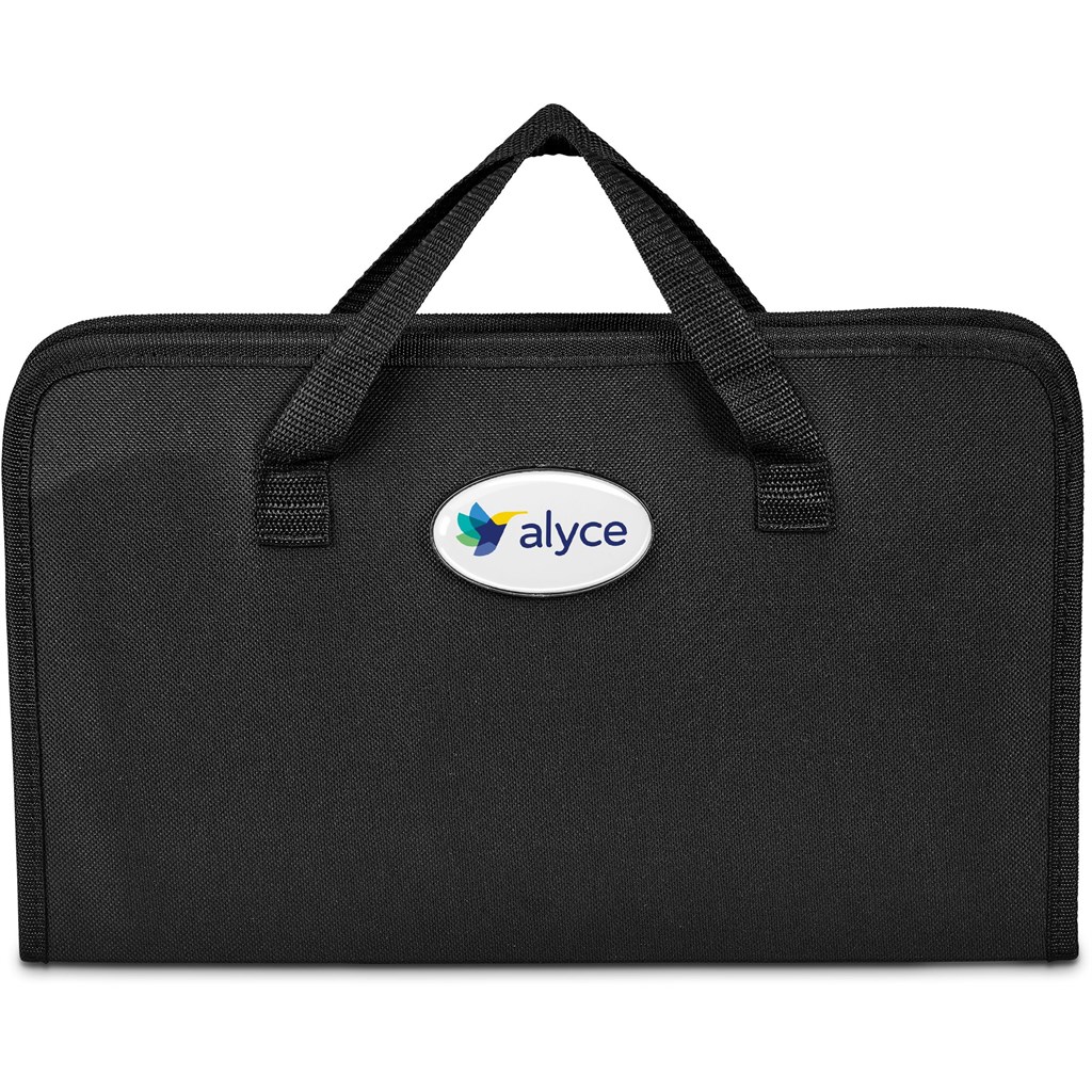 Whether it’s at that self-catering place with the small wine glasses and the blunt knives, or just out at the braai at home, this food prep set is bound to be your new best friend. It features a chef’s knife, a chef’s fork, a knife sharpener, and a serrated steak knife on one side, and a wooden cutting board on the other. All are packaged within a rigid bag with a carry handle and a recessed badge for dome branding.