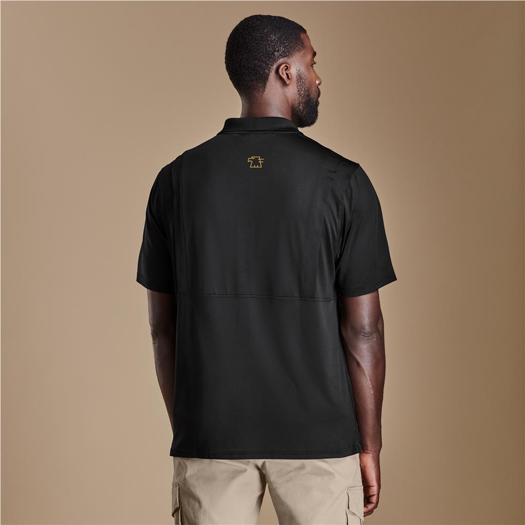 90% polyester, 10% spandex, moisture wicking and anti-bacterial finish